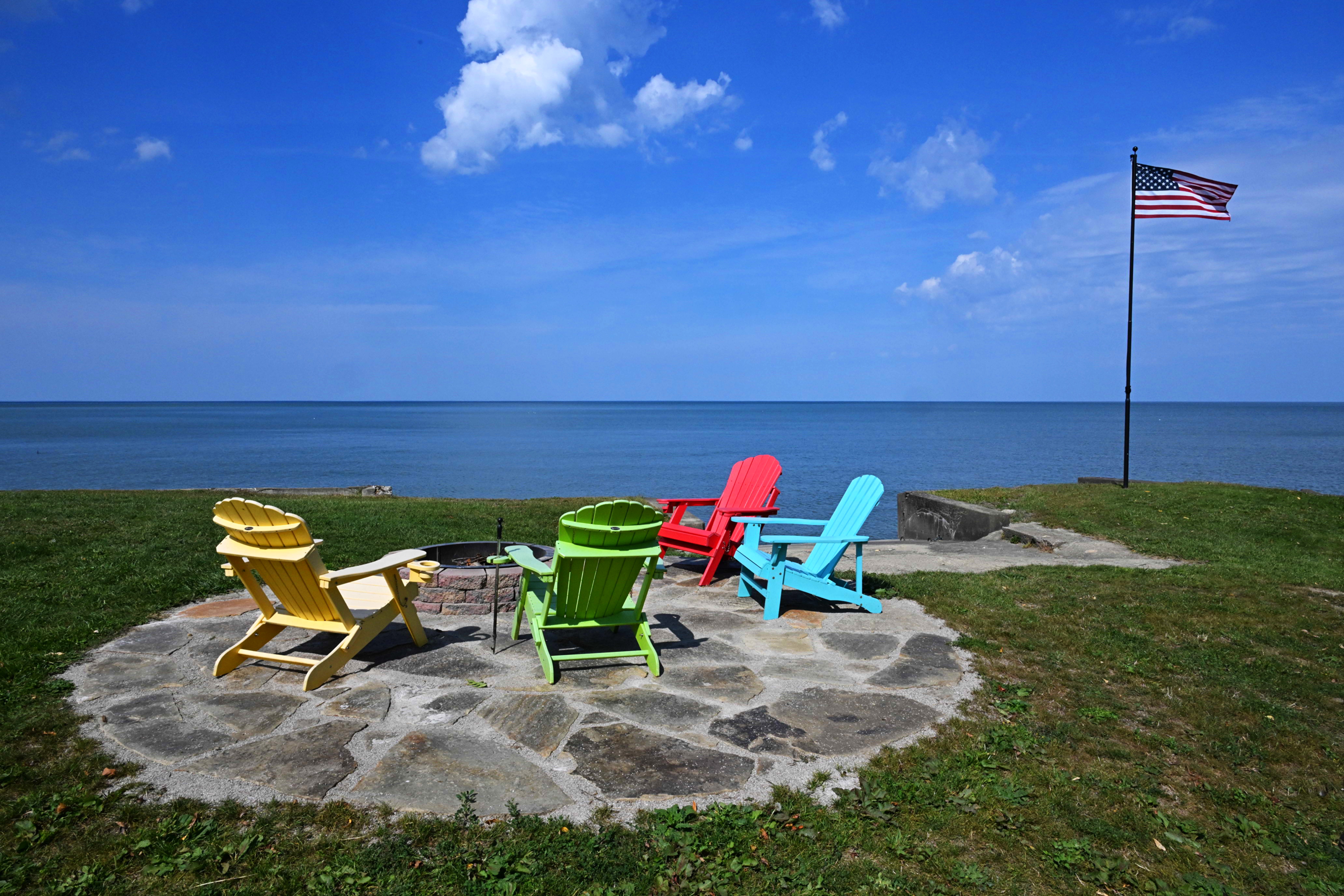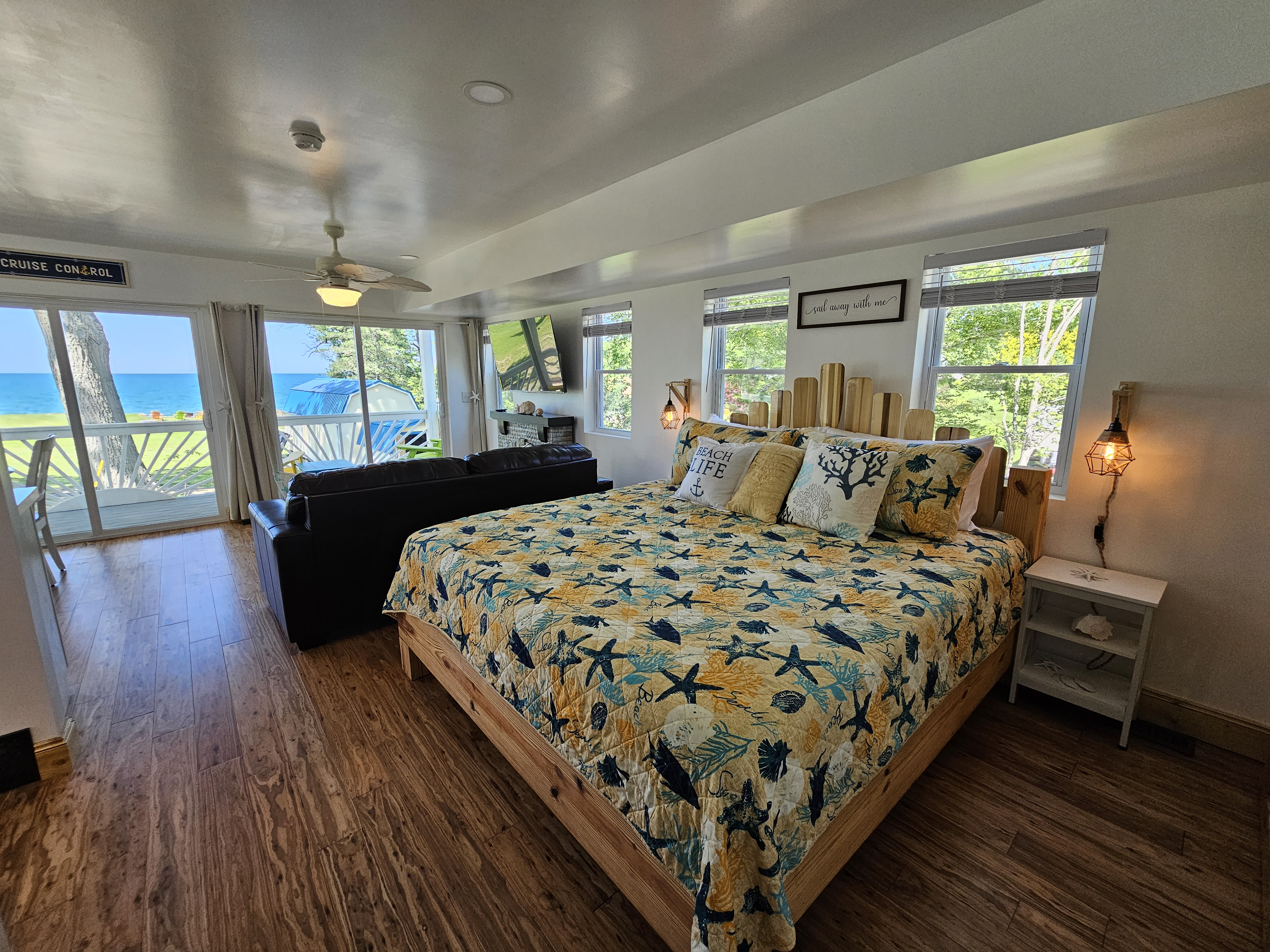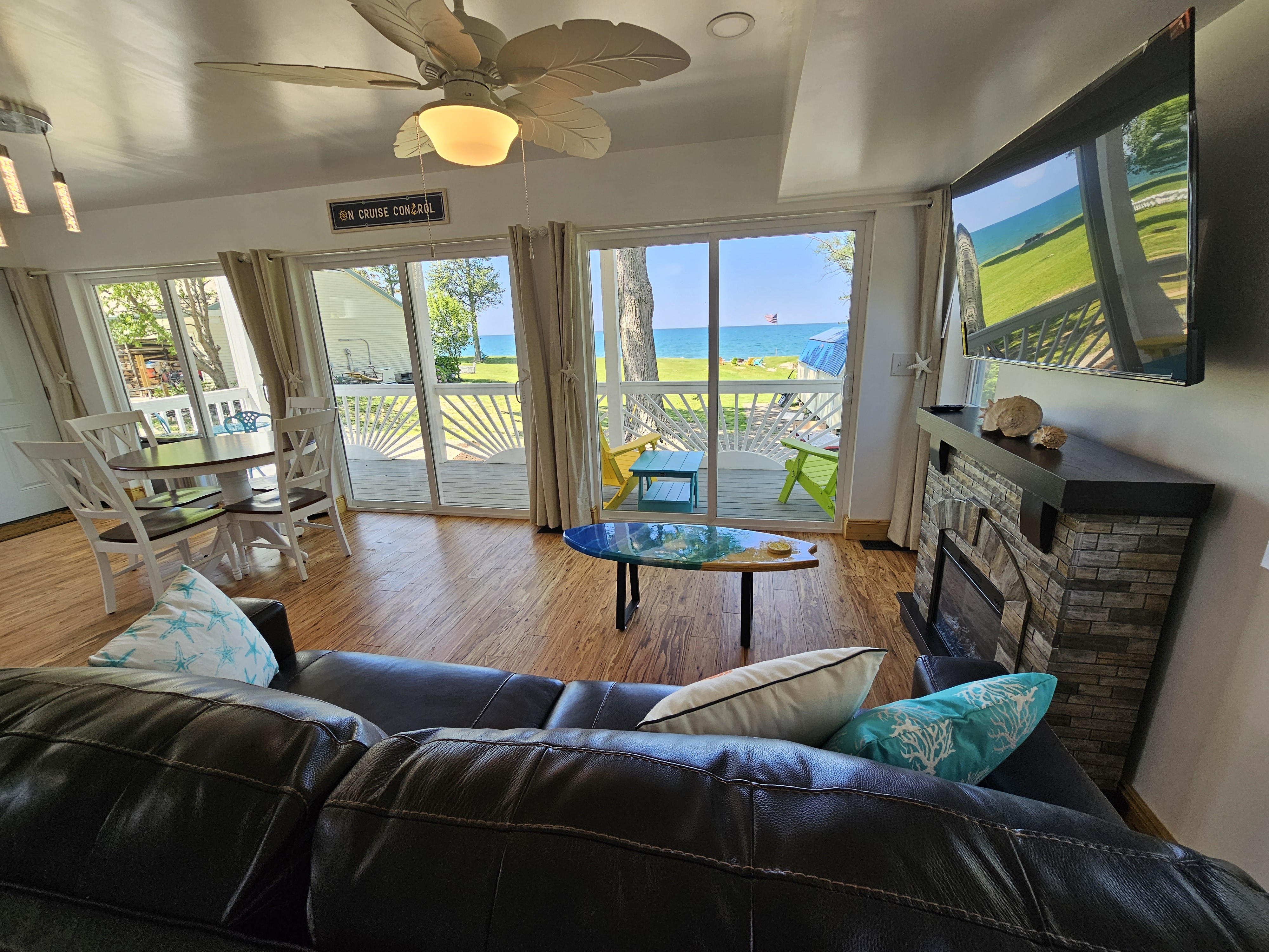 Built in 2023, SeaSide Cottage has an Open-Floor-Plan Layout, providing amazing views of the Lake Erie Water-Front through 3 large sliding glass doors, leading to a private balcony, complete with Adirondack Chairs & a boutique breakfast table and chairs. Two full bathrooms, both with showers, one larger SPA style+SPA shower, both have overhead heat & LED mirrors. A Helix brand King-size bed provides luxurious comfort, a leather couch bed (Queen), an electric fireplace, and a 50" HDTV. Designed for Romantic getaways.